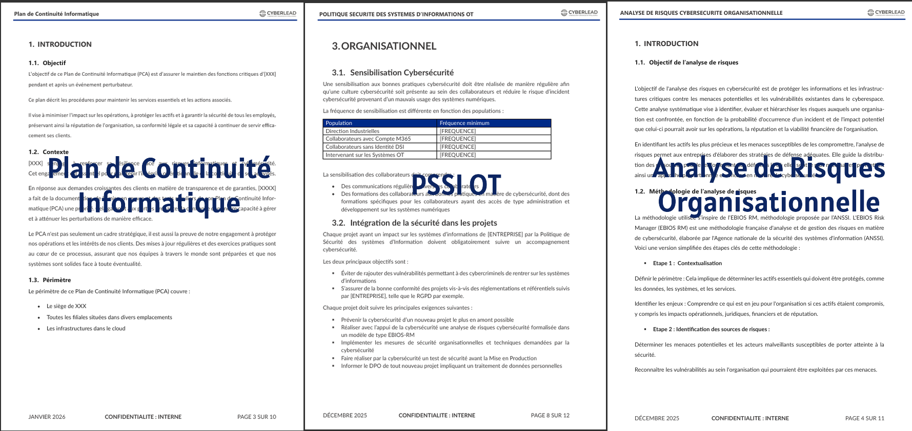Le Kit RSSI V3 repose sur des documents complets, structurés et directement exploitables. Chaque livrable est pensé pour être utilisé en situation réelle : gouvernance, conformité, projets et opérations.